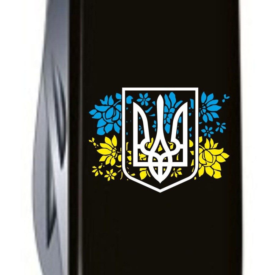 Швейцарський багатозадачний кишеньковий ніж CLIMBER 91 мм на 14 функцій із колекції Victorinox UKRAINE. Чорні накладки доповнені стійкою до стирання ультрафіолетовою печаткою символіки, зрозумілою та дорогою кожному українцю.